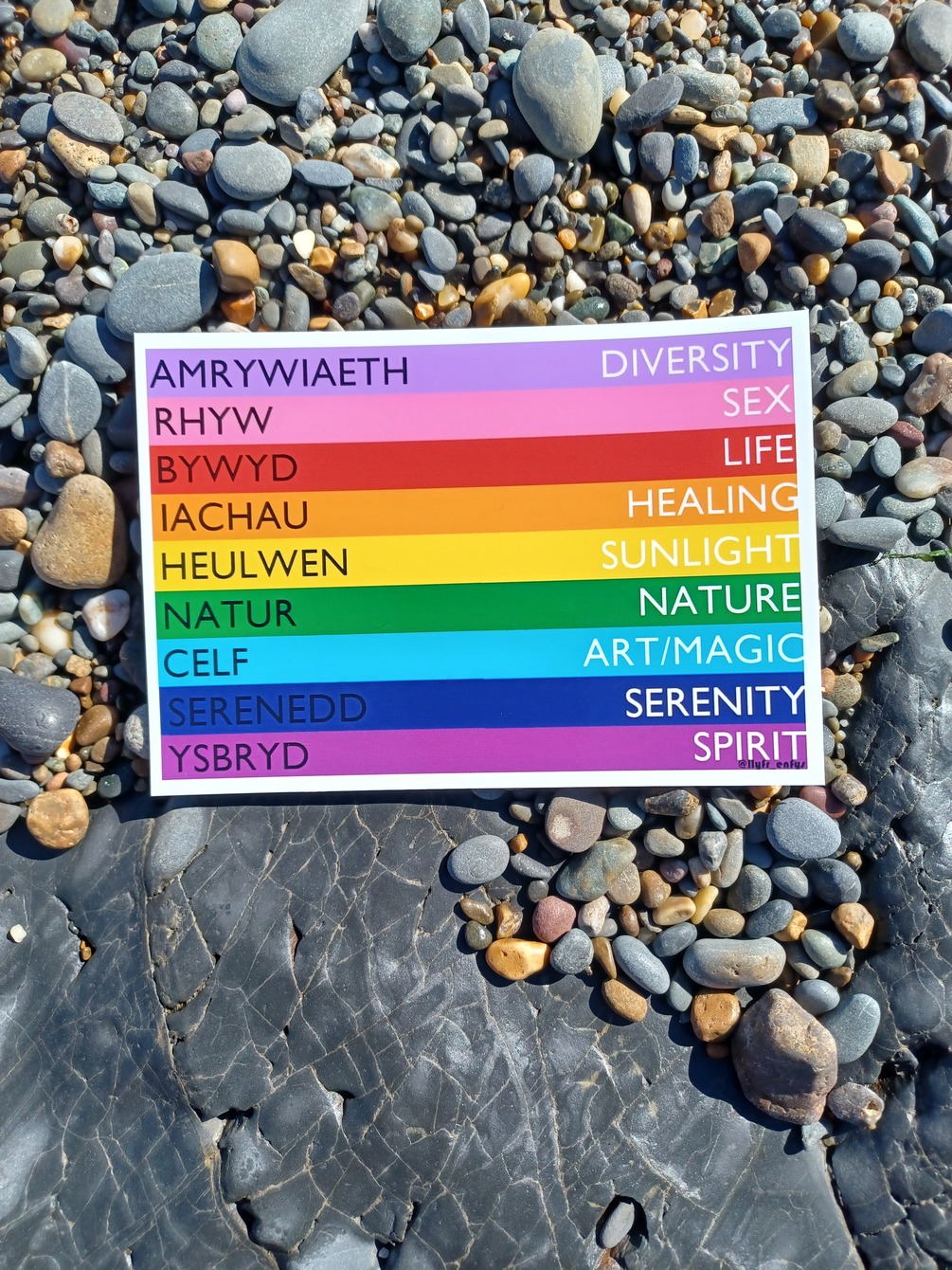 A 6 x 4 inch / 10 x 15 cm print of the 2017 Gilbert Baker pride flag. Each stripe's meaning is displayed in Welsh and in English in white and black. Pay as you feel: suggested price £3.50