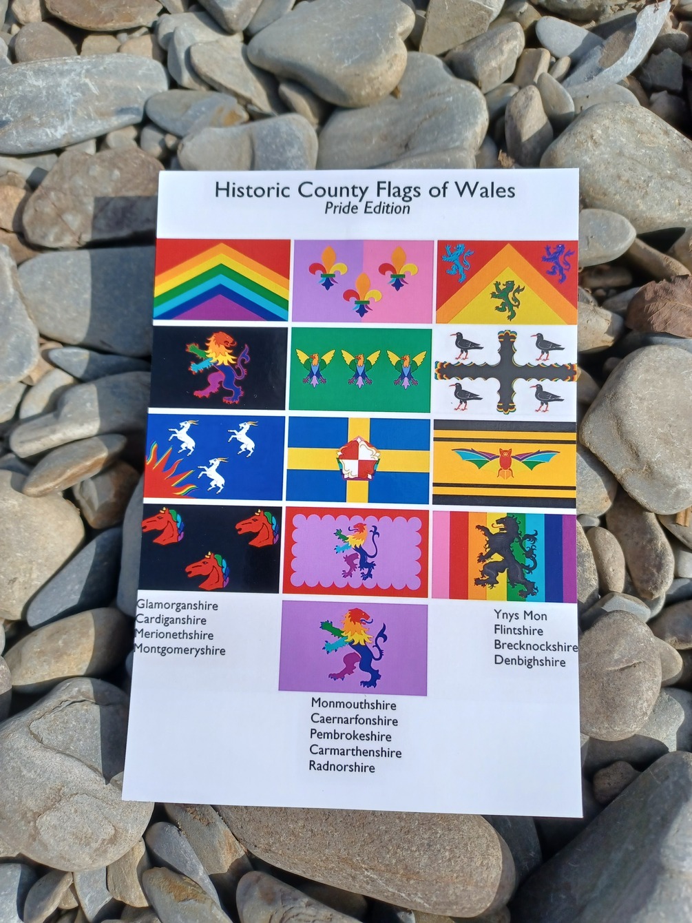A 6 x 4 inch / 10 x 15 cm print of my Welsh county flags design (pride edition). Featuring the Welsh county flags in the 2017 Gilbert Baker pride flag colours! Pay as you feel: suggested price £3.40